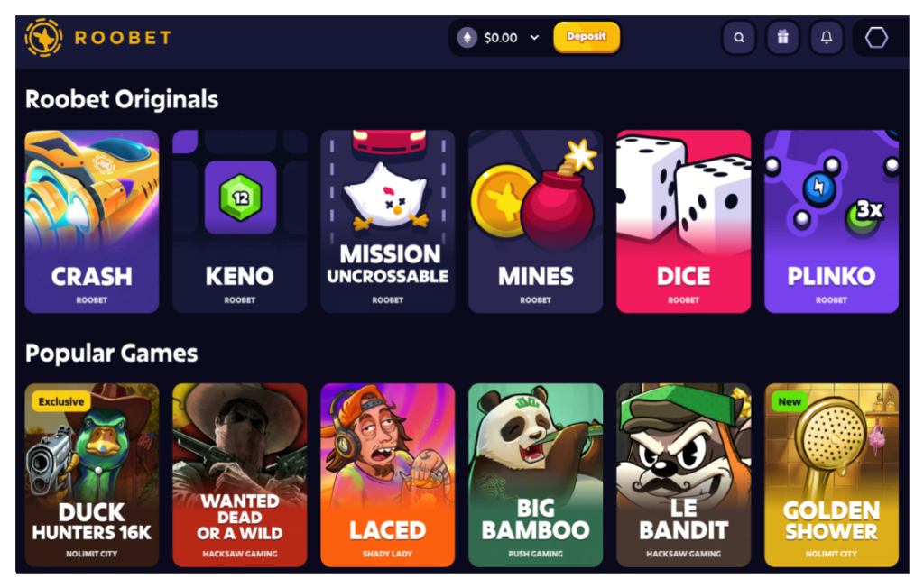 A screenshot of the casino homepage on Roobet